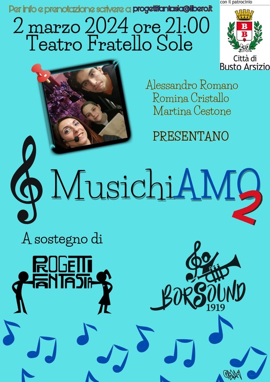 Dopo il clamoroso successo dell’anno scorso, il 2 marzo presso il Fratello Sole di Busto Arsizio, si terrà il tanto atteso concerto “musichiAMO 2”, organizzato in collaborazione con la Borsound 1919, a beneficio dell’Associazione Progetti Fantasia di Busto Arsizio.
